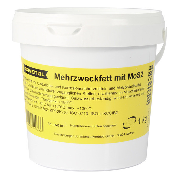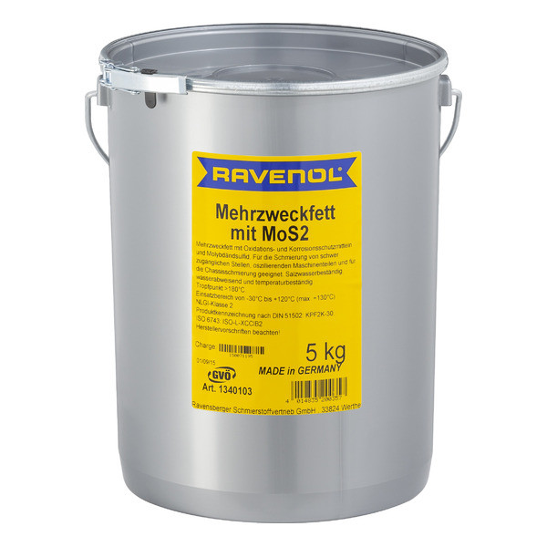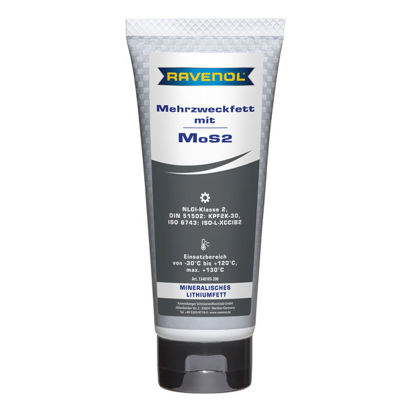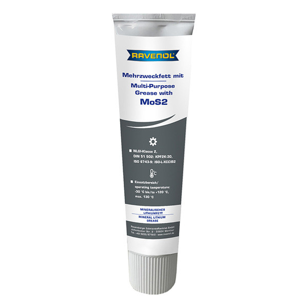 RAVENOL Mehrzweckfett mit MoS2 – минералдык негиздеги автоунаа майы, литий самыны менен коюуланган, курамында антиоксиданттык жана коррозияга каршы кошумча заттар, ошондой эле молибден дисульфиди (MoS2) бар.