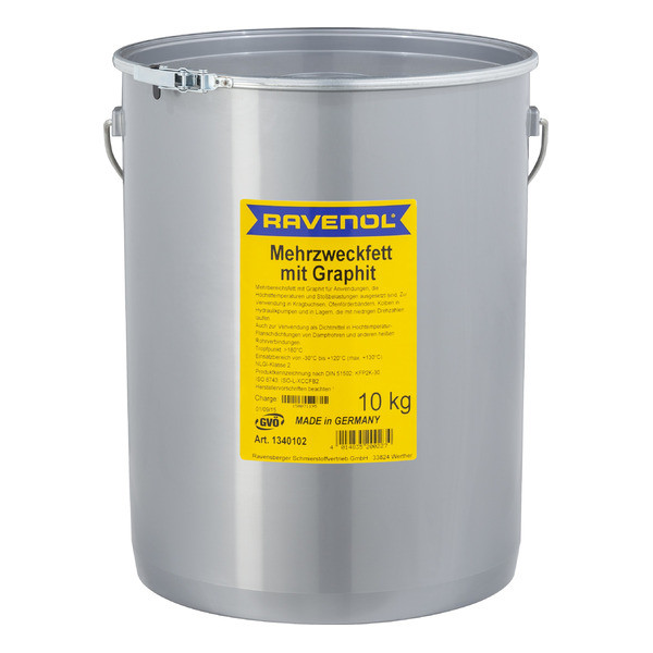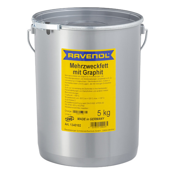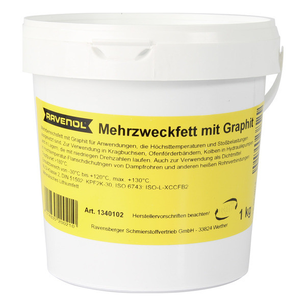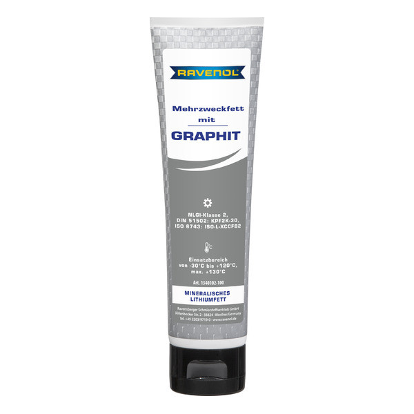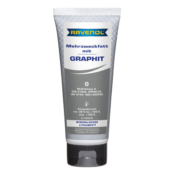 RAVENOL Mehrzweckfett mit Graphit – Германияда өндүрүлгөн, минералдык май базасында литий самыны загуститель катары колдонулган, универсалдуу жана сууга туруктуу пластикалык май. Графиттин кошулушу жогорку температура шарттарында майдын жүк көтөрүмдүүлүгүн жогорулатат. Жогорку даражада тазаланган базалык май курамында 3%дан аз полициклдик ароматтык кошулмаларды камтыйт. Графит жогорку температурада металл беттеринде май пленкасын түзүп, оптималдуу майлоону камсыз кылат.