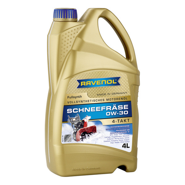 RAVENOL Schneefraese 4-Takt 0W-30 – жогорку сапаттагы, жашыл түстөгү толугу менен синтетикалык мотор майы, төмөн температурада колдонулуучу кичи көлөмдөгү 4 тактылуу кыймылдаткычтар үчүн ылайыкталган.