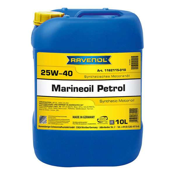 RAVENOL MARINEOIL PETROL 25W-40 Synthetic – инжектордук система менен жабдылган төрт тактуу асма кайыктар үчүн атайын иштелип чыккан синтетикалык негиздеги мотор майы. Жогорку айланууларда жана жүктөмдөрдө да кемчиликсиз майланууну, аз күлдүү кошулмалардын жардамы менен эскирүүдөн жана коррозиядан ишенимдүү коргоону камсыз кылат. Көк түскө боёлгон.