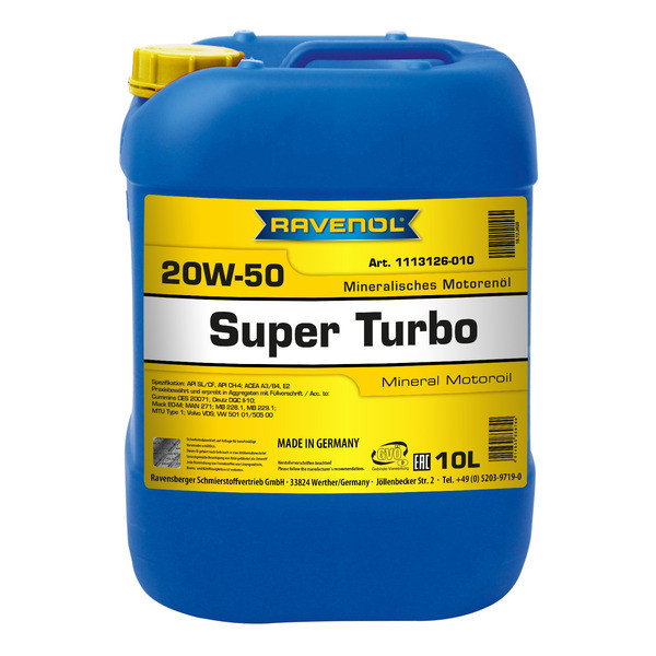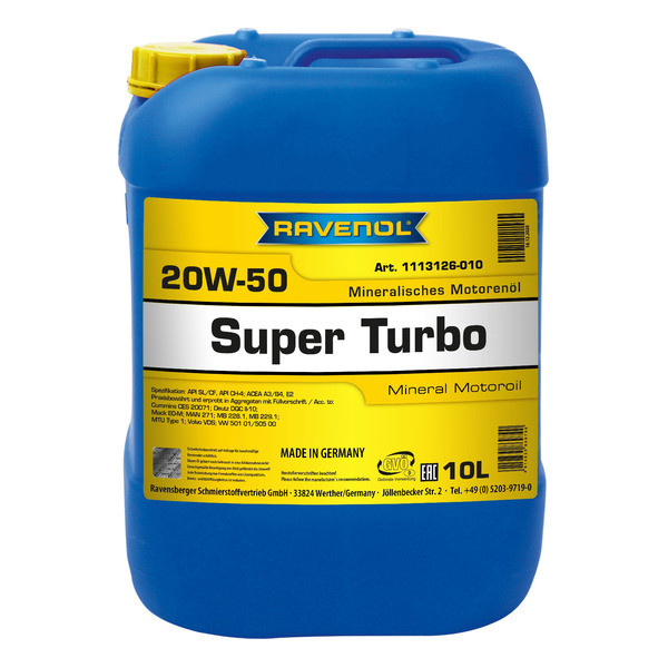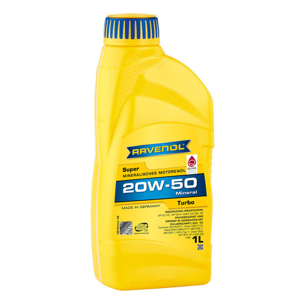 RAVENOL SUPER TURBO SAE 20W-50 is a universal multigrade engine oil for passenger car gasoline and diesel engines with or without turbocharging. Excellent Features by special solvent refined base oils and special additives. Minimizes friction and wear, good cold start properties. Extended oil change intervals according to manufacturer instructions.