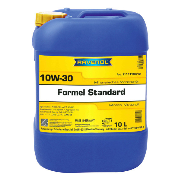 RAVENOL Formel Standard SAE 10W-30 – минералдык мотор майы, жеңил бензин жана дизель кыймылдаткычтары үчүн, турбонаддуву менен жана ансыз, ошондой эле коммерциялык автотранспорт үчүн өндүрүлгөн.