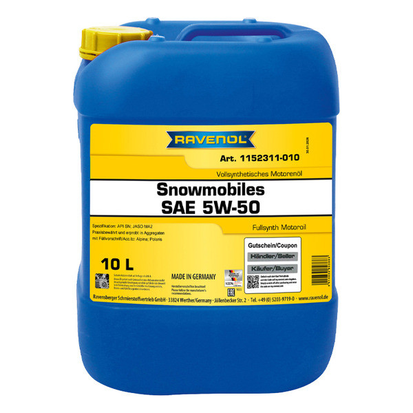 RAVENOL Snowmobiles 4-Takt Fullsynth. – 4Т кыймылдаткычтар үчүн жогорку сапаттагы, толугу менен синтетикалык мотор майы. Жашыл түскө боёлгон жана заманбап синтетикалык технологиянын негизинде иштелип чыккан.