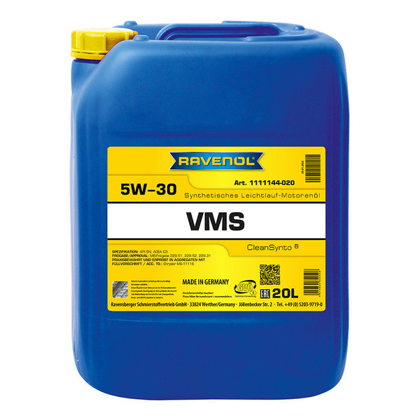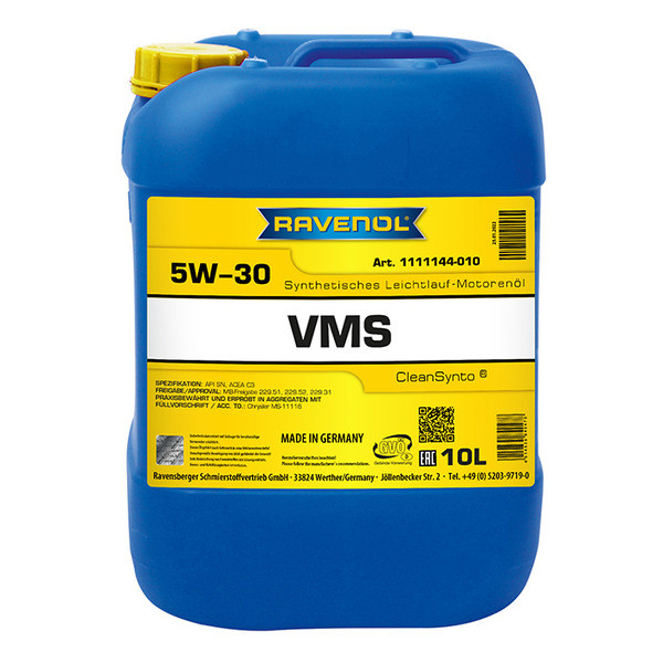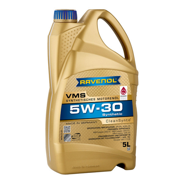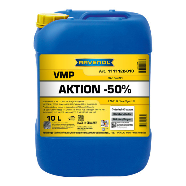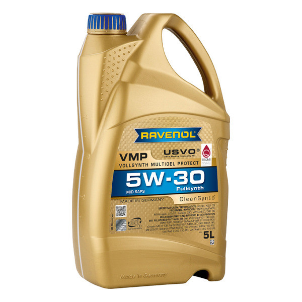 RAVENOL VMP 5W-30 – USVO® жана CleanSynto® технологиялары менен даярдалган, толук синтетикалык, жеңил агымдуу, орточо күлдүү (MID SAPS) мотор майы, бензин жана дизель жеңил автомашиналарынын, ошондой эле түздөн-түз отун чачуусу жана турбонаддуву бар кыймылдаткычтары үчүн. Май алмаштыруу интервалдары автоөндүрүүчүнүн талаптарына ылайык узартылган.